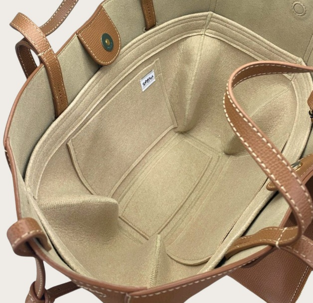 By supporting the base and separating everyday items, the organizer helps the bag keep its sculptural form without making it feel stiff or over structured.